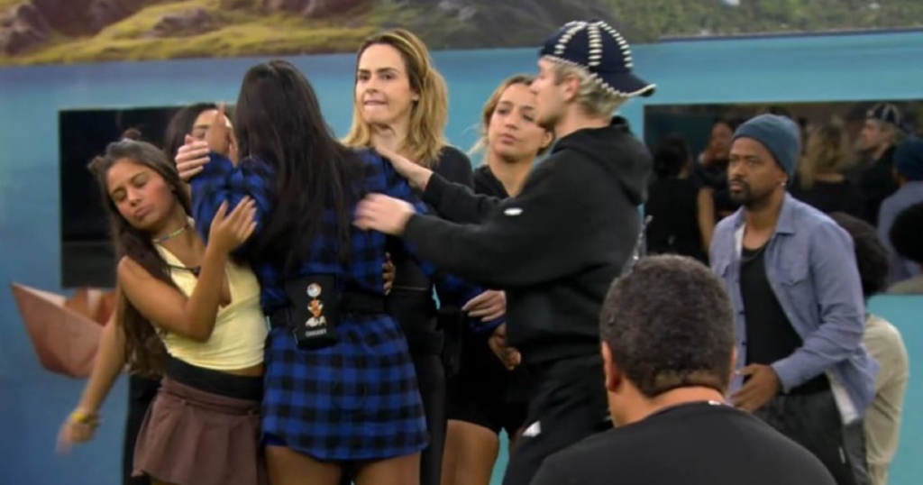 A troca de acusações continuou quando Jordana Morais criticou a postura da adversária no jogo. “Frouxa é você. A gente foi tentar fazer um combinado para somar voto, e você sugeriu que o seu grupo traísse a gente! Joga baixo, sua covarde!”, disparou. Chaiany Andrade respondeu em seguida, trazendo à tona episódios envolvendo a casa de vidro. “Você deixou, você é mentirosa! Você é falsa. Você viu muito bem o que estavam fazendo”, gritou. Diante da proximidade entre as duas e do aumento da tensão, Tadeu Schmidt precisou intervir diversas vezes para encerrar o confronto e retomar a dinâmica do programa ao vivo.