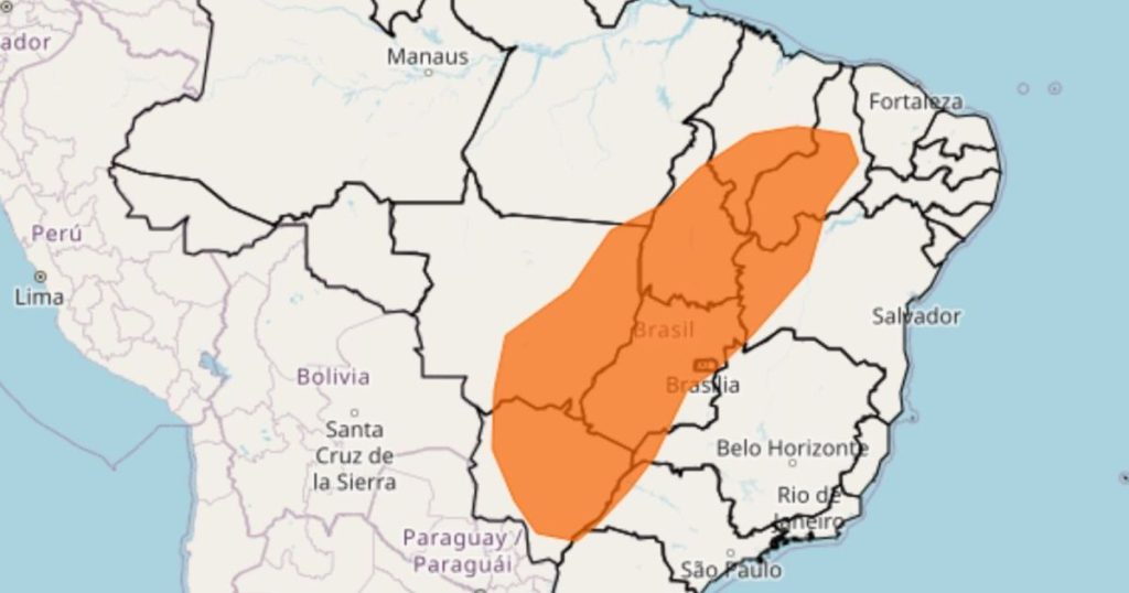 O alerta atinge a faixa central do país e principalmente os estados da região Centro-Oeste, com a maior parte do Mato Grosso e Goiás sob alerta, além das faixas leste e sul do Mato Grosso do Sul.