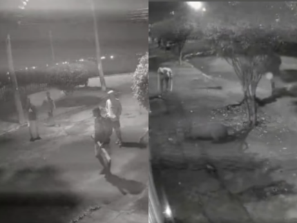 As imagens revelam a sequência do ataque. O animal aparece caminhando tranquilamente pela via quando é surpreendido pelo grupo, que surge armado com pedaços de pau. Em poucos segundos, a situação se transforma em perseguição.