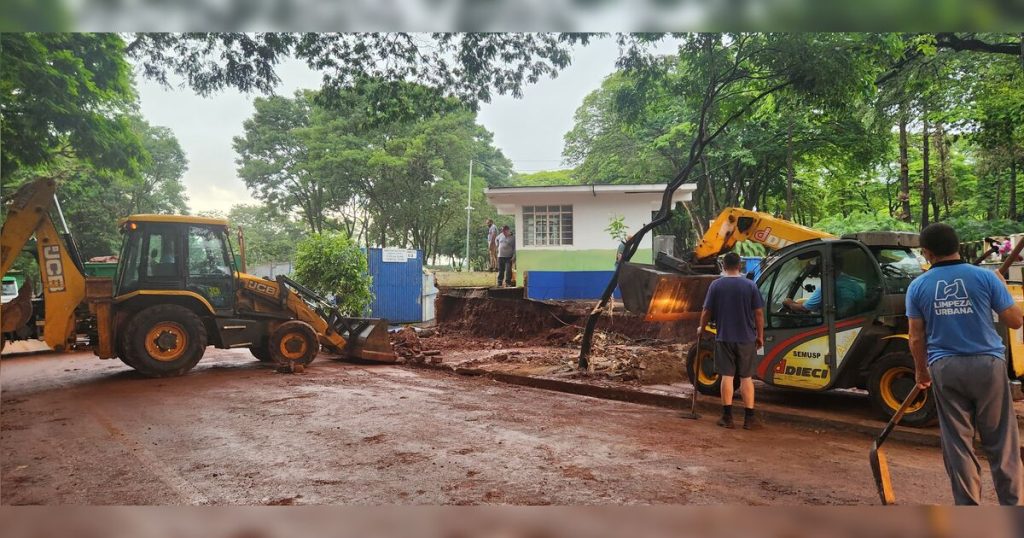“As equipes das secretarias de Infraestrutra e Limpeza Urbana trabalham no local. De forma emergencial, será colocado tapumes e, quando as condições climáticas melhorarem, a parte do muro que cedeu será refeita”.