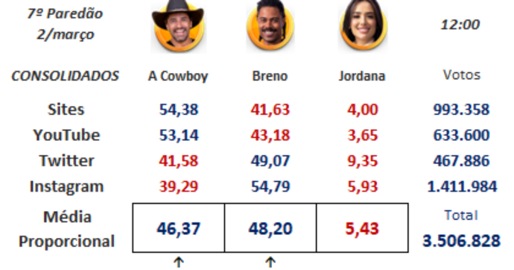 Segundo o Votalhada, a disputa para ter o privilégio do Quarto Secreto é acirrada. A última atualização mostra um empate técnico entre dois participantes. Enquanto Breno surge com 48,20% dos votos para vencer o Paredão Falso, Cowboy está com 46,37%. Já Jordana não tem a menor chance já que conta com apenas 5,43%.