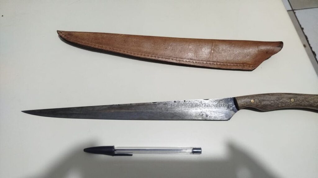 A Polícia Militar foi acionada por um dos filhos do casal. Segundo ele, seu pai estava embriagado e agrediu verbalmente a mãe, segurou-a pelo braço e ameaçou-a com uma faca de 18 centímetros de lâmina.