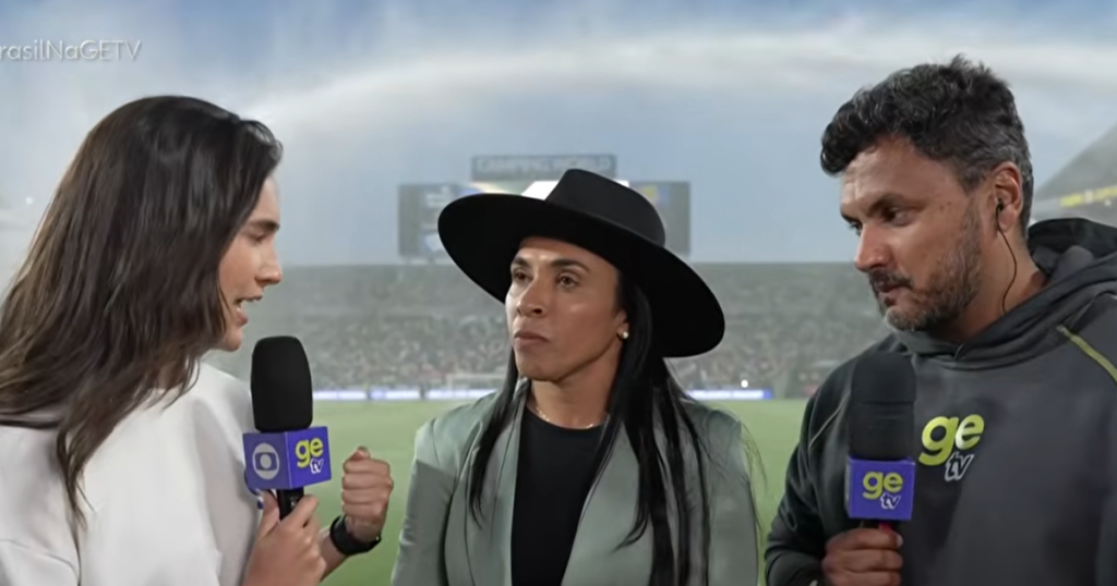 Os jornalistas Mariana Spinelli e Cahê Mota conversavam ao vivo com Marta sobre a expectativa em cima da partida da Seleção Brasileira, mas foram interrompidos pela mangueira que molhava o gramado antes da partida.