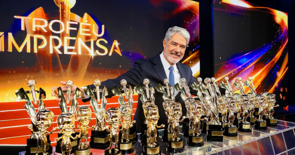 William Bonner fez uma participação icônica no Troféu Imprensa, exibido na noite deste domingo, 26, no SBT. O jornalista buscou os 33 estuetas que recebeu nos últimos anos e fez uma longa participação no palco do programa, onde conversou bem à vontade com Patrícia Abravanel e Celso Portiolli.