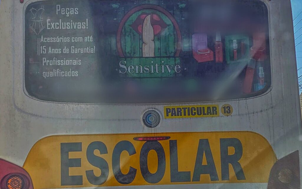 Um ônibus escolar foi flagrado circulando com uma propaganda de um sex shop em Santa Rita do Sapucaí (MG). A imagem, feita nesta semana, mostra o anúncio de produtos eróticos no vidro traseiro do veículo, espaço geralmente usado para divulgação de marcas de empresas.