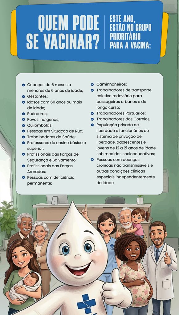 A vacina deste ano protege contra as cepas A/Missouri/11/2025 (H1N1), A/Singapore/GP20238/2024 (H3N2) e B/Austria/1359417/2021 (linhagem Victoria) e pode ser aplicada junto a outras vacinas do Calendário Nacional de Imunização.