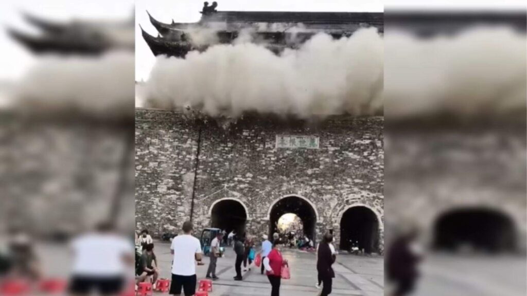 Que susto! O telhado de uma torre histórica no condado de Fengyang, na China, cerca de 320 quilômetros de Pequim, acabou desabando e assustou turistas que visitavam o local.