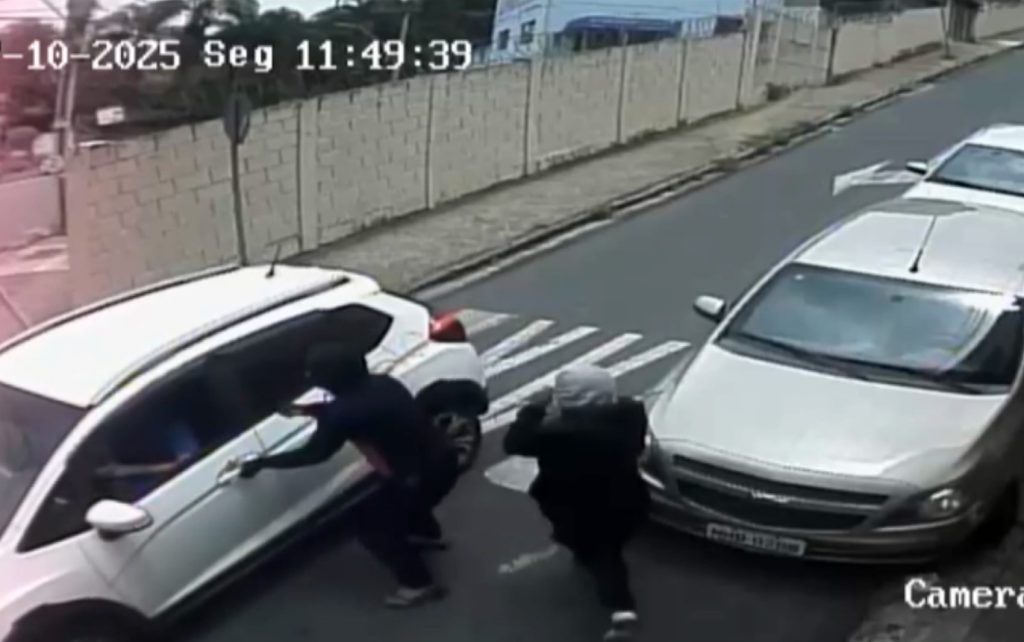 Nas imagens, o motorista de um carro branco para no cruzamento quando os suspeitos, encapuzados, se aproximam. Um deles aparece armado. O bandido tenta abrir a porta, o motorista tenta avançar com o veículo, mas é impedido.