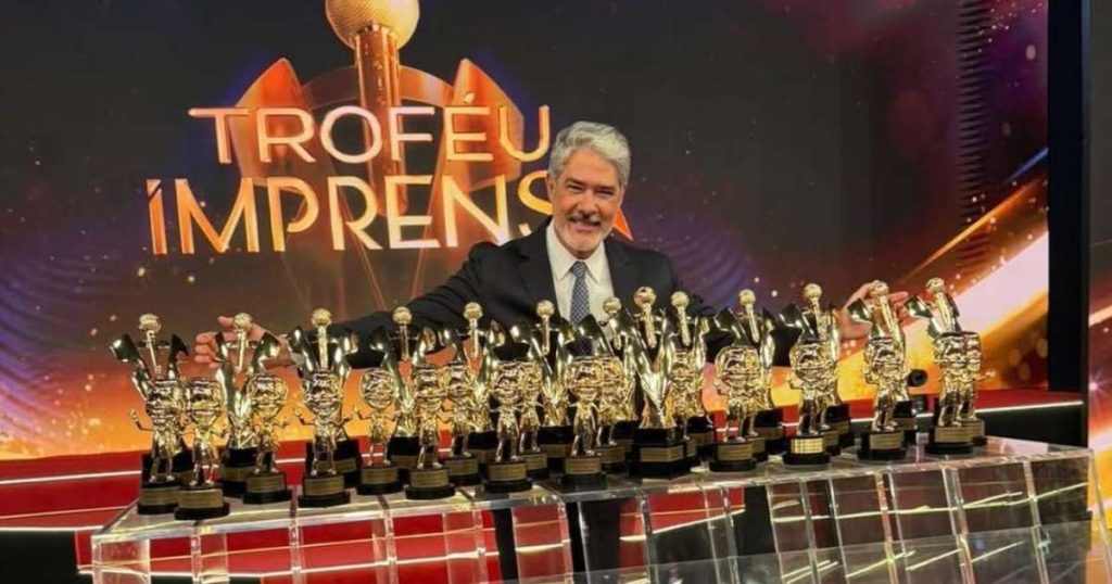 William Bonner não saiu de mãos vazias do Troféu Imprensa, do SBT, na noite desta quarta-feira, 15. O jornalista recebeu 33 estatuetas de uma só vez, quantidade acumulada de edições anteriores da cerimônia.